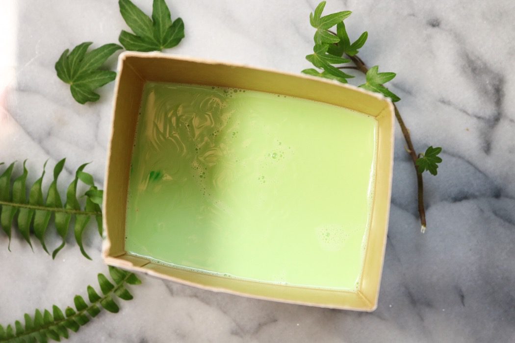 4) Smält den sista skålen med den vita massan, blanda i några droppar grön färg och doftolja. Häll den gröna massan över den vita på samma sätt som tidigare. Låt torka över natten.