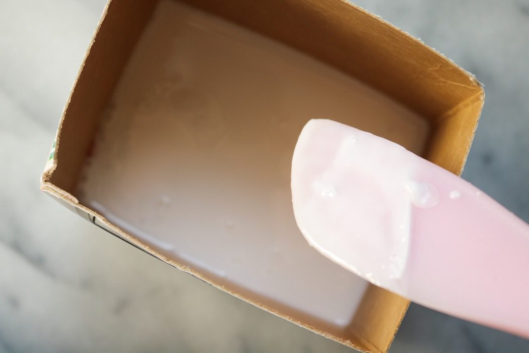 Dags att ta bort mjölkartongen, det river man enkelt av med händerna.