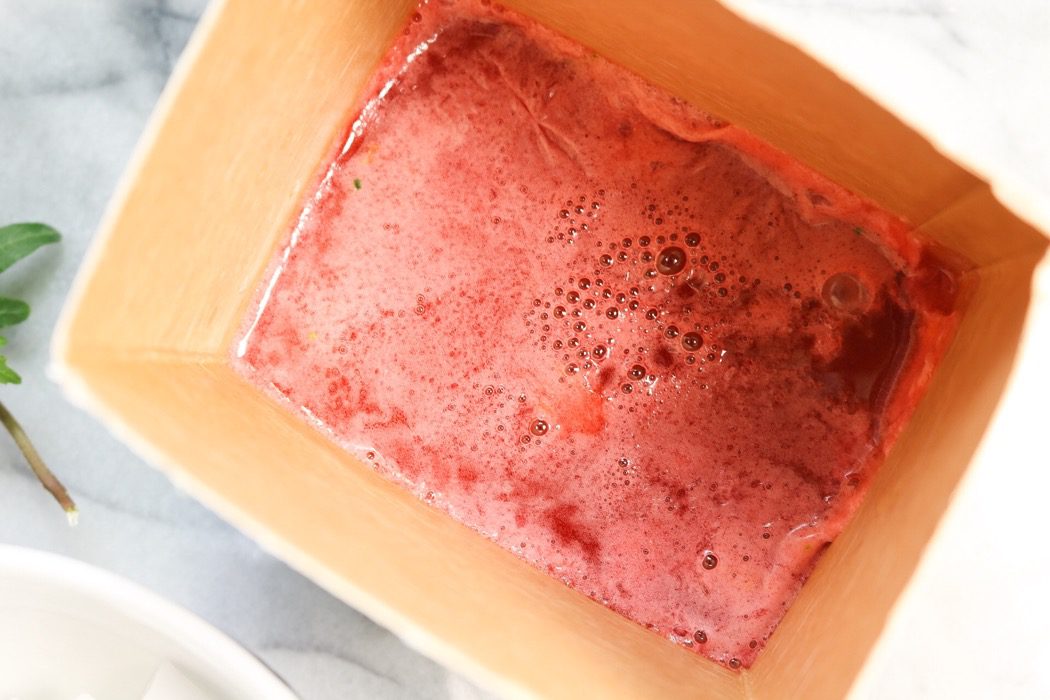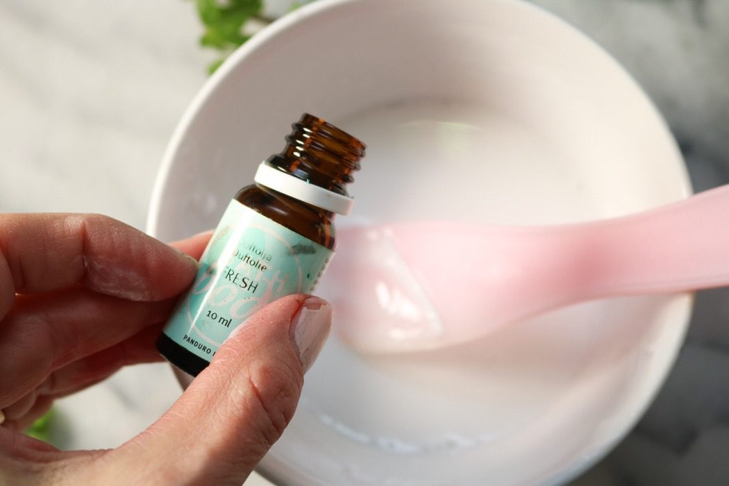 2) Rör försiktigt ner de röda färgdropparna i massan. Droppa även i några droppar doftolja. Häll ner den röda massan i formen, låt stelna ca 15-30 min.